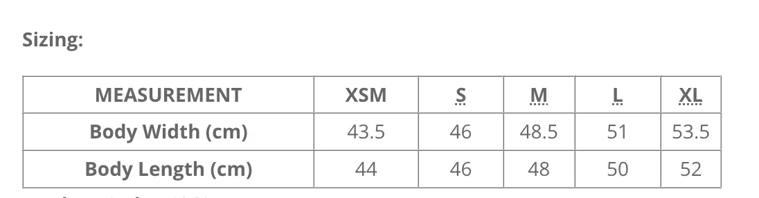 | Sizes | Extra Small (XS), Small (S), Medium (M), Large (L), Extra Large (XL) |